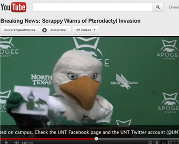 I also helped plan and implement a social media event geared toward increased audience engagement and increased awareness of the university. The project was known as Project Pterodactyl and featured a mock pterodactyl invasion on campus. The campaign included a public service announcement from UNT’s beloved mascot Scrappy, a mock news release and a list of safety tips. The project was a success with students and community members joining in to retweet and share the news of the invasion. Some students even began posting their own photos of the pterodactyls on campus to the UNT Facebook page.