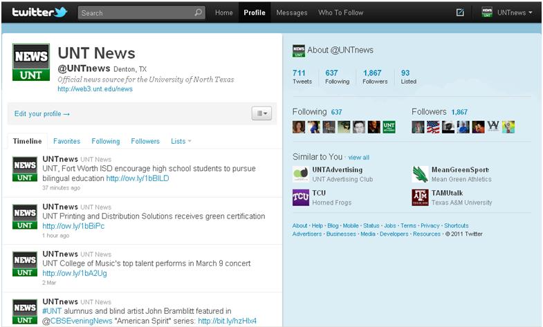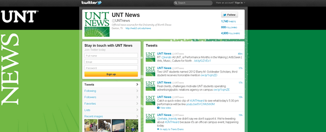 I was a key member of the team that launched the UNT News Twitter feed in 2009, and I have been responsible for managing the account since its launch. The page is growing rapidly, and now has nearly 5,000 followers. I also manage a personal Twitter account that I use for personal development and relationship building.